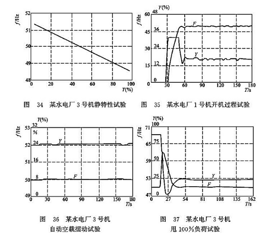 圖34~圖38給出的是幾個典型的現(xiàn)場試驗結(jié)果曲線,從中可以看出,不但調(diào)節(jié)過程性能指標(biāo)完全滿足有關(guān)規(guī)程要求,其動態(tài)調(diào)節(jié)時的總體過渡過程趨勢也很令人滿意。