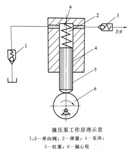 增大,形成局部真空,油箱中的油液在大氣壓的作用下,頂開(kāi)單向閥1進(jìn)入a中,實(shí)現(xiàn)吸油。當(dāng)偏心向上轉(zhuǎn)時(shí),推動(dòng)柱塞向上移動(dòng),容積a逐漸減小,油液受擠壓而產(chǎn)生壓力,使單向閥1關(guān)閉,油液頂開(kāi)單向閥3而輸入系統(tǒng),實(shí)現(xiàn)壓油。這樣液壓泵就將原動(dòng)機(jī)輸入的機(jī)械能轉(zhuǎn)換為液體的壓力能。偏心輪連續(xù)轉(zhuǎn)動(dòng),液壓泵不斷地吸油和壓油,也就不斷地向系統(tǒng)供油。由上可知,液壓泵是通過(guò)密閉容積作周期性的變化來(lái)完成吸油和排油工作的,其輸出油量的多少取決于柱塞往復(fù)運(yùn)動(dòng)的次數(shù)和密封容積變化的大小。這種依靠密封工作容積的變化,將機(jī)械能轉(zhuǎn)換為壓力能的泵,稱為容積式液壓泵。