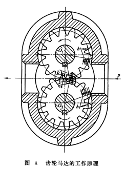 (1)工作原理 齒輪馬達的工作原理如圖A所示。圖中P點為兩齒輪的嚙合點。設(shè)齒輪的齒高為h,嚙合點P到兩齒根的距離分別為a和b。由于a和b都小于h,所以當壓力油作用到齒面上時(如圖中箭頭所示,齒面上兩邊受力平衡部分都未用箭頭表示),在兩個齒輪上就各有一個使它們產(chǎn)生轉(zhuǎn)矩的作用力:其中作用在下齒輪的力為pB (h-a);作用在上齒輪的力為pB (h-b),p為輸入油液壓力,B為齒寬。在上述力的作用下,兩齒輪按圖示方向回轉(zhuǎn),并把液壓油帶到低壓腔隨著輪齒的嚙合而排出,同時在液壓馬達的輸出軸上輸出一定的轉(zhuǎn)矩和轉(zhuǎn)速。