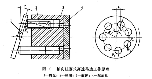 (1)工作原理柱塞式高速馬達一般都是軸向式,圖C所示為其工作原理。斜盤1和配油盤4固定不動,缸體3及其上的柱塞2可繞缸體的水平軸線旋轉(zhuǎn)。當壓力油經(jīng)配油盤通入缸孔進入柱塞底部時,柱塞受油壓作用而向外頂出,緊緊壓在斜盤面上,這時斜盤對柱塞的反作用力為F。由于斜盤有一傾斜角γ,所以F可分解為兩個分力;一個是軸向分力Fx,平行于柱塞軸線,并與柱塞底部油壓力平衡;另一個分力是Fy,垂直于柱塞軸線。它們的計算值分別為