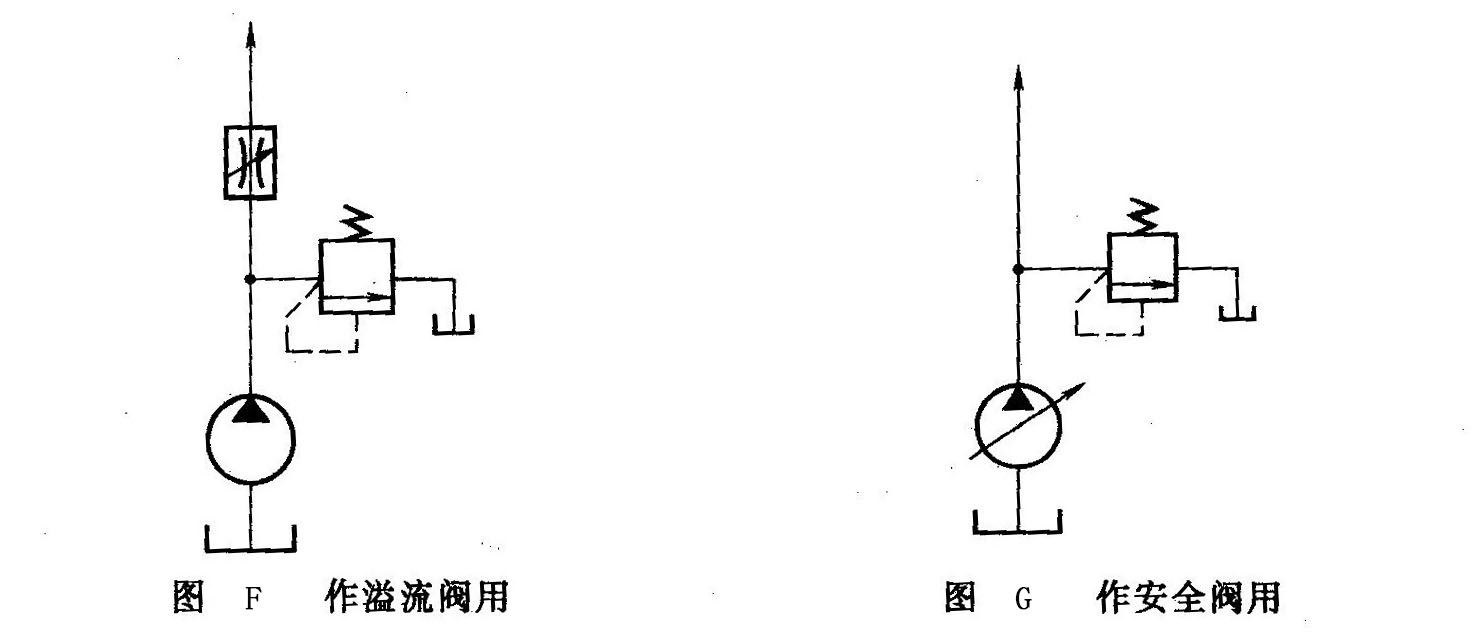 (1)作溢流閥用 在采用定量泵節(jié)流調(diào)速的液壓系統(tǒng)中,調(diào)節(jié)流量控制閥(節(jié)流閥)的開口大小可調(diào)節(jié)進(jìn)入執(zhí)行元件的流量,而定量泵多余的油液則從溢流閥溢回油箱。在工作過程中閥是處于常開狀態(tài),液壓泵的工作壓力決定予溢流閥的調(diào)整壓力且基本保持恒定。如圖F所示。