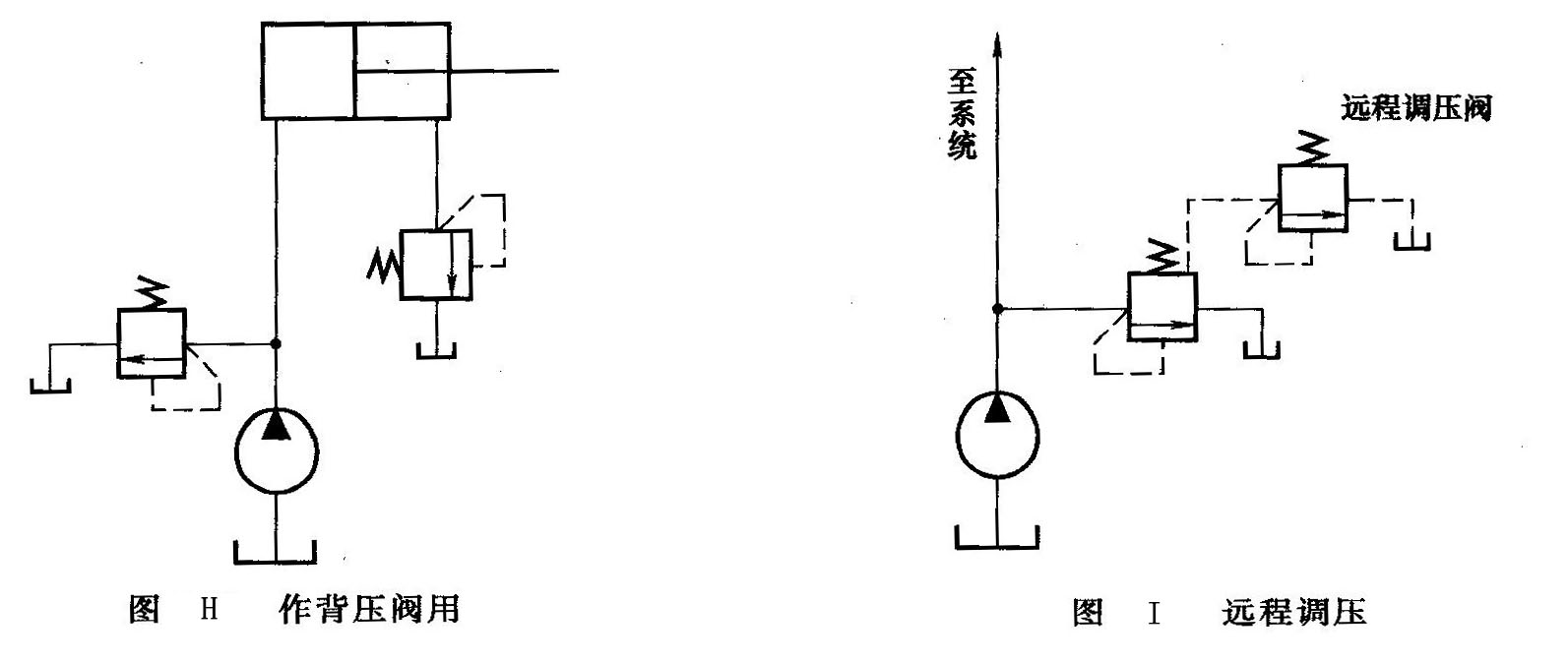 (3)作背壓閥用 在液壓系統(tǒng)的回油路上接一溢流閥(如圖H所示),可造成一定的回油阻力即背壓。背壓的存在可提高執(zhí)行元件運(yùn)動(dòng)的平穩(wěn)性。調(diào)節(jié)溢流閥的調(diào)壓彈簧可調(diào)節(jié)背壓力大小。