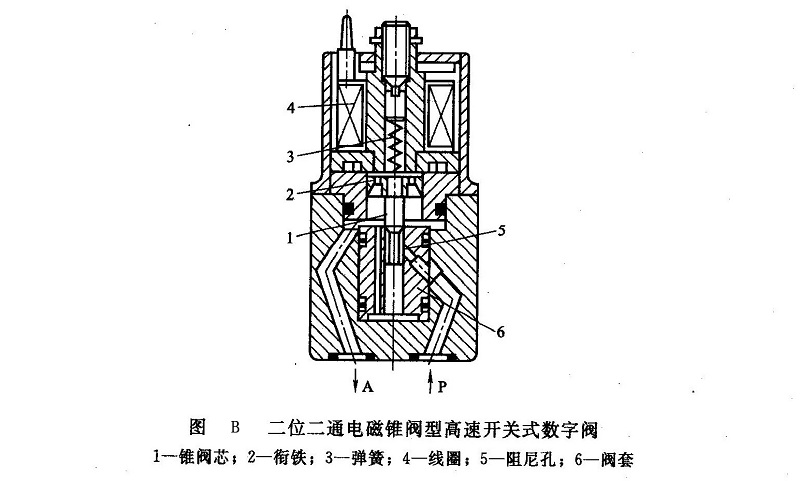 圖B所示為二位二通電磁錐閥型高速開關(guān)式數(shù)字閥。線圈4通電時,銜鐵2上移,使得錐閥芯1開啟,壓力油從P口經(jīng)閥體流人A口。斷電時,彈簧3讓錐閥關(guān)閉。閥套6上的阻尼孔5用以補償液動力。