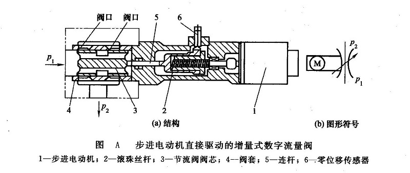 圖A所示為增量式數(shù)字流量閥的結(jié)構(gòu)及圖形符號。步進(jìn)電動機1的轉(zhuǎn)動通過滾珠絲桿2轉(zhuǎn)化為軸向位移,帶動節(jié)流閥閥芯3移動,控制閥口的開度,從而實現(xiàn)流量調(diào)節(jié)。該閥閥口由相對運動的閥芯3和閥套4組成,閥套有兩個通流孔口,左邊為全周開口,右邊為非全周開口,閥芯移動時先打開右邊的節(jié)流口,得到較小的流量;閥芯繼續(xù)移動,則打開左邊閥口,流量增大。連桿5的熱膨脹可起溫度補償作用。零位移傳感器6使閥芯在每個控制周期終了回零位,提高閥的重復(fù)精度。