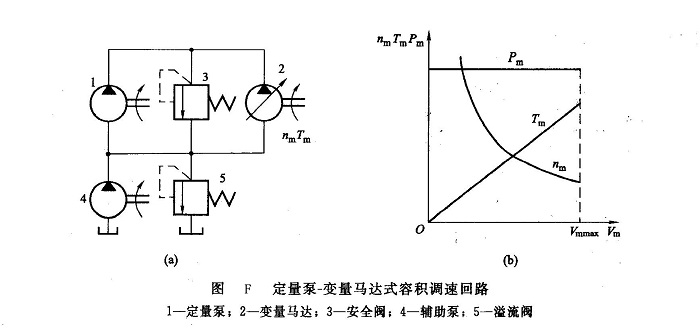a.油路組成及工作原理這種調(diào)速回路的油路結(jié)構(gòu)如圖F(a)所示。3為安全閥;4為補(bǔ)油用的輔助泵,5為輔助泵定壓的溢流閥。溢流閥5的壓力調(diào)得較低,使主泵1的吸油腔有一定的壓力。采用輔助泵補(bǔ)油可改善主泵的吸油條件。
