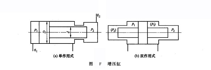 單作用增壓缸在小活塞運(yùn)動到終點(diǎn)時,不能再輸出高壓液體,需要將活塞退回到左端位置,再向右行時才又輸出高壓液體,即只能在一次行程中輸出高壓液體。為了克服這一缺點(diǎn),可采用雙作用增壓缸,如圖F(b)所示,由兩個高壓端連續(xù)向系統(tǒng)供油。