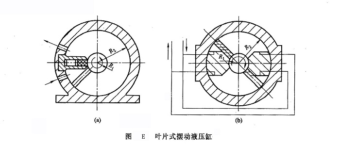 圖E(b)所示為雙葉片式擺動缸,它的擺動角度較小,可達(dá)150°,它的輸出轉(zhuǎn)矩是單葉片式的兩倍,而角速度則是單葉片式的一半。