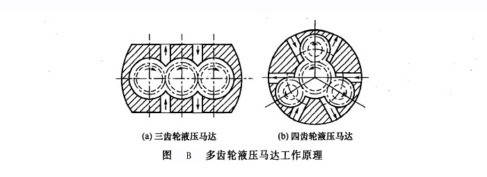 (2)多齒輪式漸開線外嚙合齒輪馬達(dá)的工作原理 多齒輪的齒輪馬達(dá)可以增加輸出轉(zhuǎn)矩。這種馬達(dá)通常由幾個(gè)空轉(zhuǎn)齒輪與一個(gè)轉(zhuǎn)矩輸出齒輪組成,空轉(zhuǎn)齒輪均勻地分布在轉(zhuǎn)矩輸出齒輪的周圍,轉(zhuǎn)矩輸出齒輪比空轉(zhuǎn)齒輪大[但三齒輪的馬達(dá)一般都將齒輪做得同樣大,如圖B (a)所示]。圖B(b)所示為四齒輪液壓馬達(dá),轉(zhuǎn)矩輸出齒輪與輸出軸連在一起,其作用是將空轉(zhuǎn)齒輪的液壓力所產(chǎn)生的轉(zhuǎn)矩加以放大。此時(shí),馬達(dá)殼體(或前、后蓋)上開有相應(yīng)的幾個(gè)進(jìn)油口和幾個(gè)回油口,分別和高壓油管及回油管相連接。有的馬達(dá)齒輪數(shù)多達(dá)11個(gè),當(dāng)工作壓差△p =1OMPa和轉(zhuǎn)速,2≤lOOr/min時(shí),其輸出轉(zhuǎn)矩高達(dá)21000N·m。