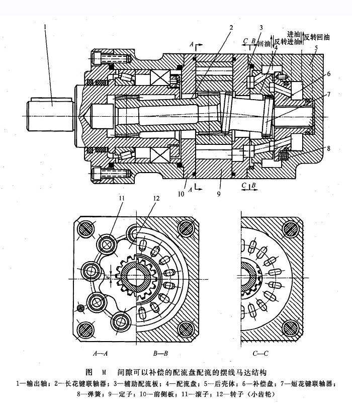 圖M所示為間隙可以補償?shù)呐淞鞅P配流的擺線馬達。圖S~圖O分別為該馬達中的輔助配流板、配流盤和補償盤的結構。當馬達通人壓力油后,轉(zhuǎn)子12在定子9內(nèi)既公轉(zhuǎn)又自轉(zhuǎn),其自轉(zhuǎn)運動一方面通過長花鍵聯(lián)軸器2傳給輸出軸1,另一方面又通過短花鍵聯(lián)軸器7帶動配流盤4旋轉(zhuǎn)。配流盤4、補償盤6和輔助配流板3上的配流孔道的設置原理與圖K所示的擺線馬達中的配流軸、殼體配流孔及輔助配流板中配流孔道的設置原理相同。由于有這種連續(xù)的配流關系,所以馬達的轉(zhuǎn)子和輸出軸就能連續(xù)地旋轉(zhuǎn)。由于補償盤與配流盤之間以及配流盤與輔助配流板之間均具有當前合理的壓緊系數(shù),所以這種馬達工作一段時間后,補償盤會自動向左移動,以補償補償盤與配流盤之間、配流盤與輔助配流板之間的磨損,從而保持了較高的容積效率。