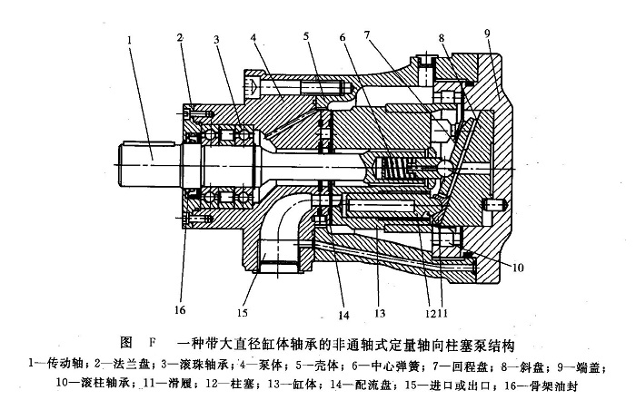 a.定量泵圖F所示為一種帶大直徑缸體軸承的非通軸式定量軸向柱塞泵結(jié)構(gòu)。在缸體13的軸向缸孔中裝有柱塞12,各柱塞的球形頭部裝有滑履11。回程機構(gòu)由中心彈簧6和回程盤7等組成,將滑履緊緊地壓在斜盤8的斜面上,使泵具有一定的自吸能力。當(dāng)缸體由傳動軸1帶動旋轉(zhuǎn)時,柱塞相對缸體作往復(fù)運動,缸底的通油孔經(jīng)配流盤14上的配油窗口完成吸、壓油工作。缸體支撐在滾柱軸承10上,使斜盤給缸體的徑向分力可由滾子軸承來承受,從而使傳動軸和缸體只受轉(zhuǎn)矩而沒有彎矩的作用。柱塞和滑履中間的小孔可使缸孔中的壓力油通至滑履和斜盤的接觸平面間,形成一靜壓油膜,減小了滑履和斜盤之間的磨損。在缸體的前端設(shè)置一個大直徑的專用短滾柱軸承10以直接承受側(cè)向力,傳動軸僅用來傳遞轉(zhuǎn)矩。由于斜盤8始終固定于定量端蓋9上,不能改變柱塞的行程,故泵的排量是固定的。