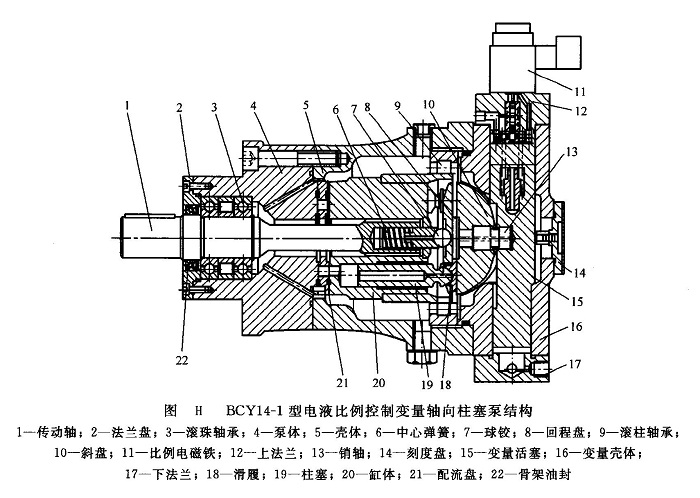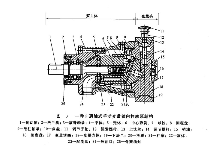 b.變量泵 圖G所示為一種非通軸式手動變量軸向柱塞泵結(jié)構(gòu)。該泵在圖G所示的定量泵結(jié)構(gòu)基礎(chǔ)上添設(shè)變量頭部分而構(gòu)成,前者在此稱為泵主體部分。缸體的前端仍然設(shè)置短滾柱軸承9以直接承受側(cè)向力。