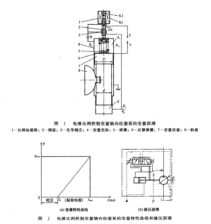 圖H所示為BCY14-1型電液比例控制變量軸向柱塞泵結(jié)構(gòu),其主體部分由傳動軸1帶動缸體20旋轉(zhuǎn),使均勻分布在缸體上的7個柱塞繞傳動軸中心線轉(zhuǎn)動,通過中心彈簧6將柱滑組件中的滑履18壓在斜盤的斜面上。從而柱塞隨著缸體的旋轉(zhuǎn)而作往復(fù)運動,完成吸油和壓油動作。其變量機構(gòu)采用了比例電磁鐵和外控油壓控制,并基于“流量位移力反饋”原理工作。通過改變輸入比例電磁鐵11的電流大小來改變泵的流量,輸入電流與泵的流量成比例關(guān)系,其電液比例控制變量原理如圖I所示。當(dāng)比例電磁鐵1輸入電流為零時,控制滑閥的先導(dǎo)閥芯3在反饋彈簧6的作用下被推至上端,此時壓力為pc、流量為qc的外控油液進(jìn)入變量活塞7的上、下兩腔,由于上腔面積A1大于下腔面積A,故變量活塞被推向最下端位置,斜盤8的偏角為零,泵的排量也為零。當(dāng)比例電磁鐵的輸入電流增大時,先導(dǎo)閥芯3受比例電磁鐵推力的推動而下移,從而使滑閥的上閥口打開,變量活塞7上腔通過液阻R及閥的控制邊與回油腔接通,上腔壓力降低,變量活塞上移,斜盤偏角增大,泵的排量也隨之增大,同時變量活塞的移動又通過壓縮反饋彈簧作用在滑閥閥芯上,將滑閥閥芯推到平衡位置,變量活塞即維持在某一確定的平衡位置上,泵的排量也維持在某一定值。反之,當(dāng)輸入電流減小時,滑閥閥芯在反饋彈簧的作用下上移,使通向回油腔的閥口減小,進(jìn)入上腔的閥口增大,由此上腔壓力pc1增大,變量活塞向下移動,直至電磁鐵推力等于反饋彈簧力時,滑閥閥芯又回到平衡位置,使pclA1=pcA,變量活塞又在一個新的位置上平衡。在輸入電流不變的情況下,若由于負(fù)載或其他干擾原因引起變量活塞上移或下移,則變量活塞的該位移變化量.通過反饋彈簧作用在滑閥閥芯上,改變滑閥的開口,使變量活塞的上腔壓力升高或降低,以抵抗負(fù)載的變化,最終使變量活塞回到與輸入電流相對應(yīng)的位置上,即保持排量不變。由此可見,該比例變量泵可在輸入電流的作用下,對排量實現(xiàn)比例控制且有很強的抗負(fù)載干擾能力。圖J給出了泵的變量特性曲線和液壓原理。