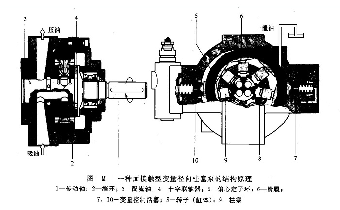 ②面接觸型徑向柱塞泵 圖M所示為一種面接觸型變量徑向柱塞泵的結(jié)構(gòu)原理。傳動(dòng)軸1通過十字聯(lián)軸器4帶動(dòng)徑向力平衡的星形轉(zhuǎn)子(缸體)8旋轉(zhuǎn)。轉(zhuǎn)子支承在配流軸3上。裝在轉(zhuǎn)子孔內(nèi)的柱塞9通過靜壓平衡的滑履6緊貼在偏心定子環(huán)5上。柱塞與滑履為球鉸連接,并由卡環(huán)鎖定。由兩個(gè)擋環(huán)2將滑履約束在偏心定子環(huán)內(nèi),運(yùn)轉(zhuǎn)時(shí)由離心力和液壓力將滑履壓向偏心定子環(huán)。當(dāng)缸體旋轉(zhuǎn)時(shí)由于偏心定子環(huán)的作用,柱塞就形成往復(fù)運(yùn)動(dòng),它的行程為偏心定子環(huán)偏心距的2倍。定子環(huán)的偏心位置可由在泵體上徑向相對位置的變量控制活塞7、10調(diào)節(jié)。吸油和壓油通過泵體和配流軸上的流道,并可由配流軸上的進(jìn)、出油口控制。由于在泵內(nèi)柱塞與定子環(huán)內(nèi)表面通過上端為圓弧面的滑履緊貼(面接觸),且產(chǎn)生的作用于內(nèi)表面的液壓力是完全靜壓平衡的,支承傳動(dòng)軸的滾動(dòng)軸承只受到外力作用,所以,泵的壽命較長。德國博世(BOSCH)公司生產(chǎn)的RKP型徑向柱塞泵即為此種結(jié)構(gòu),其最高工作壓力為38.5MPa,流量范圍為16~90mL/r,最高轉(zhuǎn)速為3500r/min。