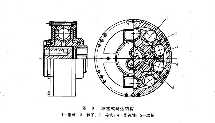 ①鋼球柱塞傳力式(球塞式)內(nèi)曲線馬達(dá) 圖D所示為球塞式馬達(dá)結(jié)構(gòu)。在轉(zhuǎn)子2上均布安裝多個(gè)鋼球1和球托5構(gòu)成的球塞副,并通過球托傳力;馬達(dá)的配流機(jī)構(gòu)為配流軸4。這種馬達(dá)的主要結(jié)構(gòu)特點(diǎn)是:用鋼球和球托代替了一般徑向柱塞馬達(dá)上的柱塞或活塞與橫梁、滾輪等零件,因而結(jié)構(gòu)簡單,成本低;由于鋼球是軸承廠大量生產(chǎn)的產(chǎn)品,供貨數(shù)量充足,精度高;運(yùn)動(dòng)副慣量小,鋼球結(jié)實(shí)可靠、耐沖擊,有利于提高轉(zhuǎn)速和在沖擊負(fù)載下連續(xù)工作;球塞副通過自潤滑復(fù)合材料制成的球托傳力,具有靜壓平衡和良好的潤滑條件,鋼球基本上無磨損;由于采用了可自動(dòng)補(bǔ)償磨損的軟性塑料活塞環(huán)來密封高壓油,又提高了該馬達(dá)的液壓機(jī)械效率和容積效率,也改善了低速穩(wěn)定性和增大了啟動(dòng)轉(zhuǎn)矩。由于配流軸4與定子為剛性連接,該馬達(dá)的進(jìn)出油口允許用鋼管連接。
