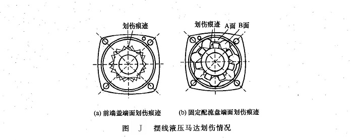 ②原因分析拆檢發(fā)現(xiàn),與馬達(dá)定子、轉(zhuǎn)子端面相接觸的前端蓋端面上和固定配流盤端面上分別有3道七邊形波紋狀的明顯劃傷痕跡。前端蓋端面上的劃傷情況較輕,劃傷深度較淺[圖J(a) ];固定配流盤端面劃傷較重,劃傷深度為0.1~0.2mm、寬度為0.1~0.3mm[圖J(b)],由于前端蓋端面及配流盤端面劃傷后,將使馬達(dá)七個(gè)封閉油腔相互串通,造成馬達(dá)內(nèi)泄漏嚴(yán)重,從而嚴(yán)重影響馬達(dá)輸出轉(zhuǎn)矩,在工作中表現(xiàn)為馬達(dá)工作無力。由于該機(jī)工作條件十分惡劣,作業(yè)對象是水泥砂石,又缺乏必要的防塵措施,使液壓油嚴(yán)重污染,造成馬達(dá)端面運(yùn)動副磨損劃傷,這是主要原因。