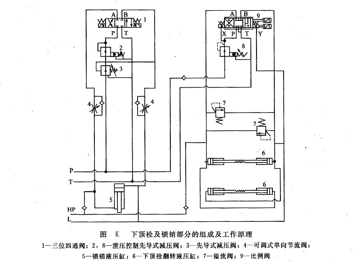 ③下頂栓及鎖銷控制部分的組成及工作原理 下頂栓及鎖銷控制部分的組成及工作原理圖如圖K所示。在下頂栓控制部分中,泄壓控制式減壓閥8控制著下頂栓翻轉(zhuǎn)時(shí)液壓缸的壓力;先導(dǎo)式比例閥的換向及開口程度由外部控制板設(shè)定的信號(hào)進(jìn)行比例控制,從而控制著下頂栓的運(yùn)動(dòng)速度,防止下頂栓由于運(yùn)動(dòng)過(guò)快而產(chǎn)生沖擊;溢流閥7主要起保護(hù)作用,防止由于過(guò)載而損壞下頂栓翻轉(zhuǎn)液壓缸。